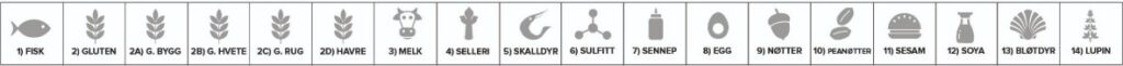 Slik leser du allergenmerkingen:Tall (1–14) viser hvilket allergen retten inneholder.